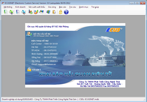 Công ty Thái Sơn đã chính thức phát hành bản nâng cấp phần mềm cho các doanh nghiệp đang sử dụng phần mềm thông quan điện tử ECUS-K 2.0 (đã triển khai từ năm 2005 cho đến nay) tại chi cục Hải quan cửa khẩu Tân Cảng thuộc Cục Hải quan TP.HCM và Chi cục Hải quan cửa khẩu Đình Vũ thuộc Cục Hải quan Hải phòng.Doanh nghiệp có thể tải về để tự nâng cấp lên phần mềm thông quan điện tử mới