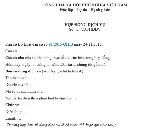 - Hợp đồng dịch vụ: Hợp đồng cung ứng dịch vụ có liên quan đến hoạt động mua bán hàng hóa, hợp đồng cung ứng dịch vụ chuyên ngành (ngân hàng, tài chính, bảo hiểm,...).