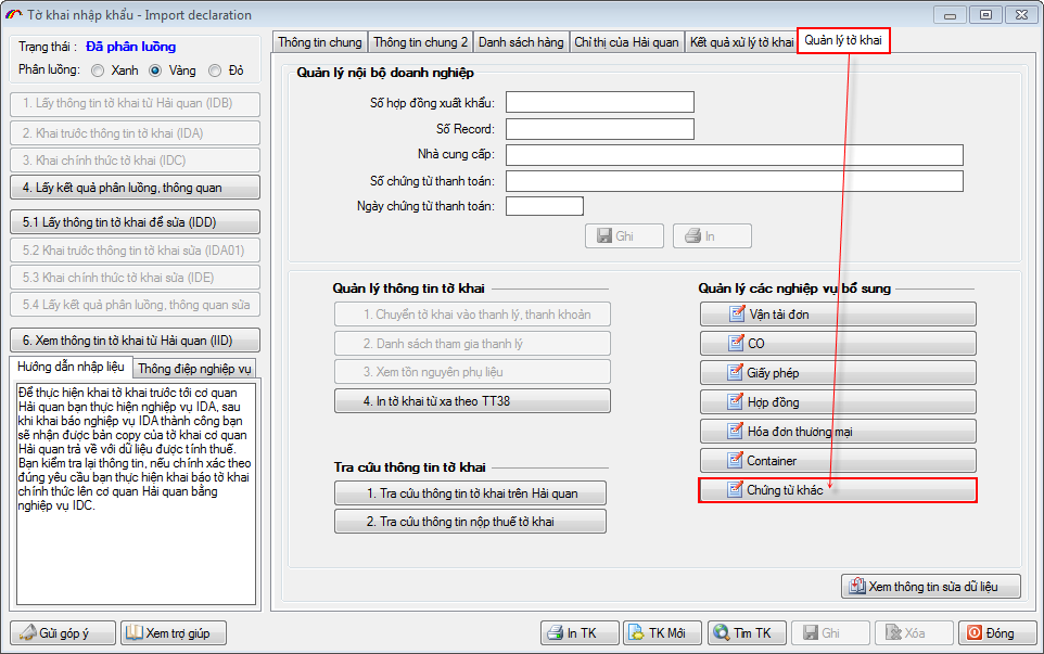 Để thực hiện khai báo, bạn mở tờ khai cần bổ sung chứng từ sau đó vào tab “Quản lý tờ khai”: