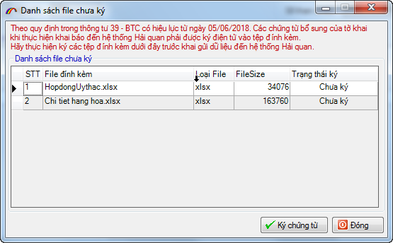 Theo quy định tại TT39, các chứng từ thuộc hồ sơ hải quan có thể ở dạng dữ liệu điện tử hoặc chứng từ giấy được chuyển đổi sang chứng từ điện tử (bản scan có xác nhận bằng chữ ký số). Do đó các file đính kèm phải được ký số trước khi gửi lên Hải quan. Khi nhấn nút khai báo, phần mềm sẽ hiện ra thông báo để ký số (nếu file đính kèm đã được ký số trước khi đính kèm, phần mềm sẽ không hiện thông báo này):