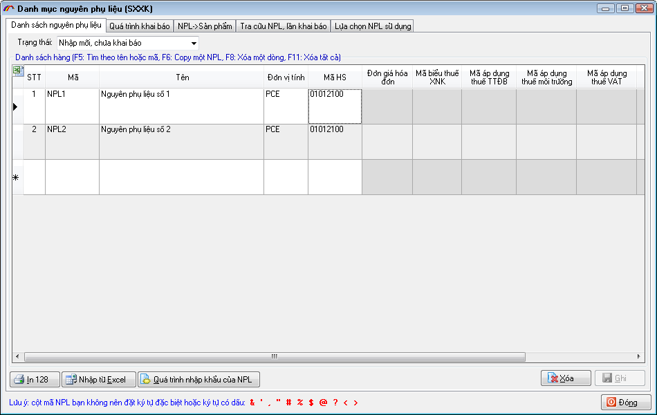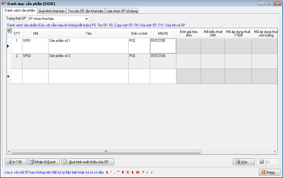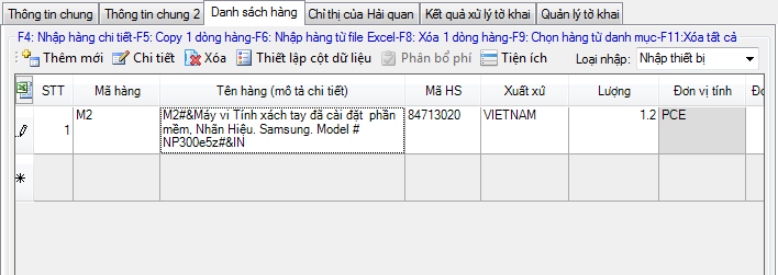 Khi nhập thông tin danh sách hàng cho tờ khai, doanh nghiệp chọn mã hàng từ danh mục thì phần mềm sẽ hỗ trợ tự động ghép vào theo cấu trúc trên.