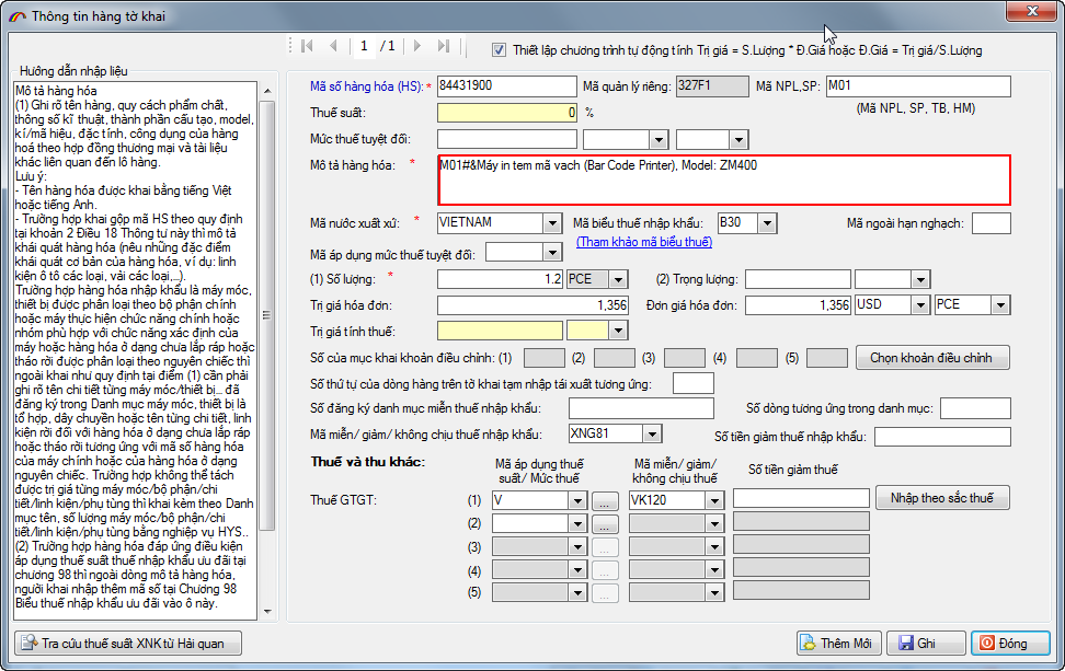 3. Khai báo mã hàng vào chỉ tiêu mô tả hàng hóa trên tờ khai nhập khẩu, xuất khẩu