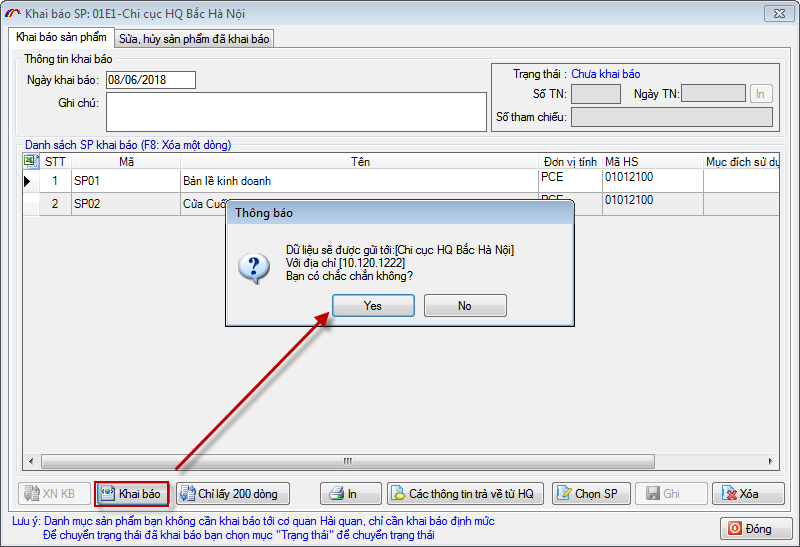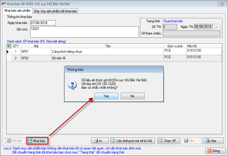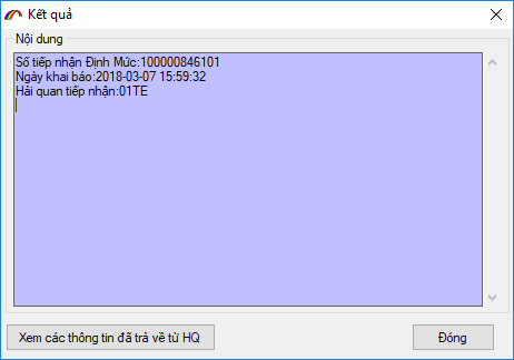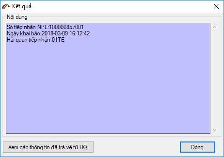 Để lấy được số tiếp nhận khai báo danh mục sản phẩm bạn nhấn nút "XNKB" hệ thống hải quan sẽ trả về thông tin về số tiếp nhận khai báo.