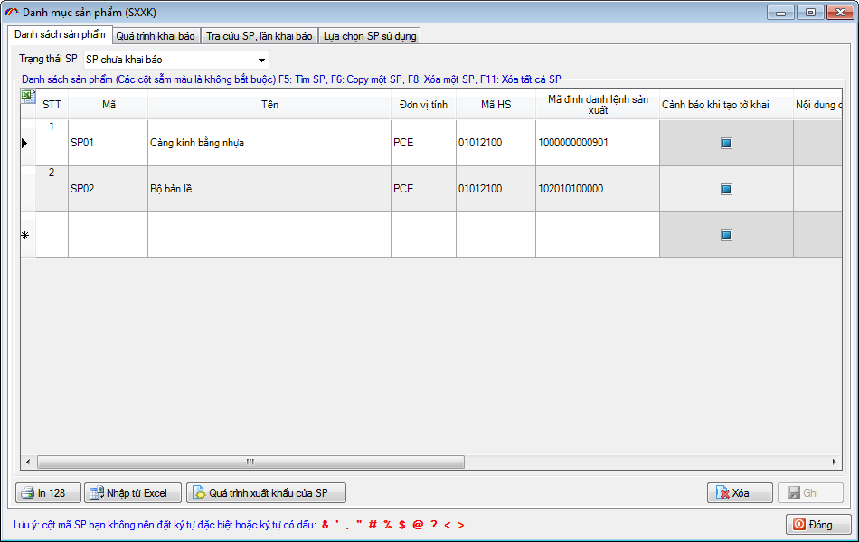 Sau khi nhập xong bạn nhấn GHI lại và chuyển qua tab “Quá trình khai báo”, chọn nút “Khai báo mới” thực hiện khai báo danh mục sản phẩm tới hệ thống hải quan.