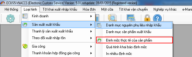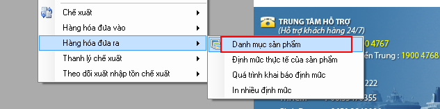 Đối với danh mục Sản phẩm xuất khẩu, bạn vào menu “Loại hình / Sản xuất xuất khẩu” và chọn “Danh mục sản phẩm khẩu”: