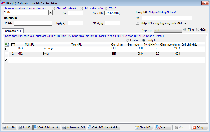 Sau khi nhập xong bạn nhấn GHI lại và chọn nút “Quá trình khai báo”, chọn nút “Khai báo mới” , giao diện màn hình khai báo Định mức sản phẩm.