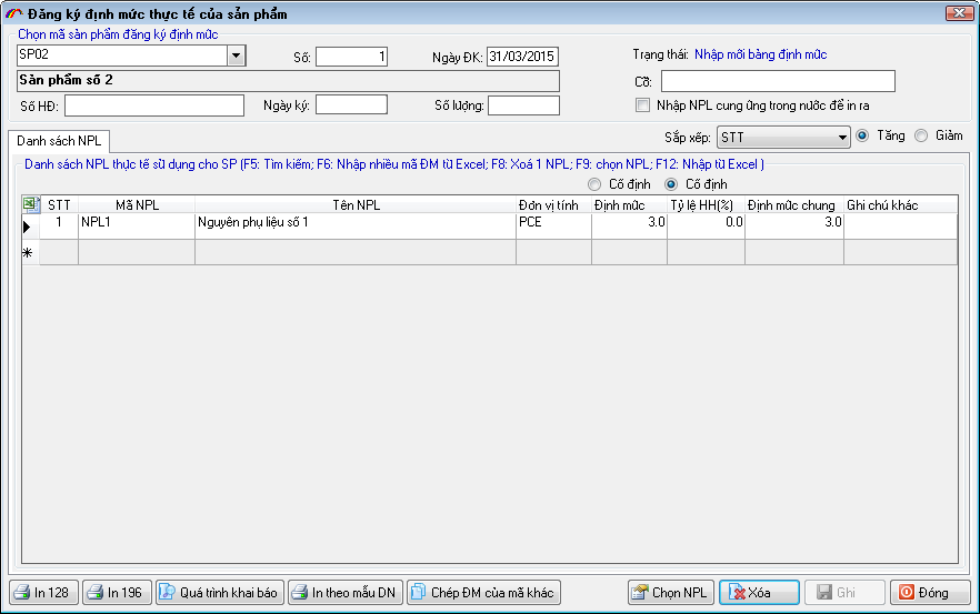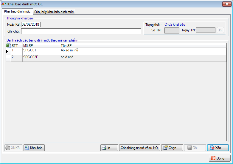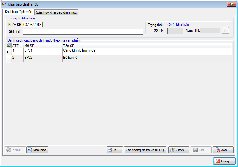 Tại đây bạn thực hiện "Ghi" dữ liệu và "khai báo" thông tin định mức sản phẩm tới hệ thống hải quan
