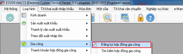 Để thêm mới một Hợp đồng gia công bạn vào menu “Loại hình / Gia công” và chọn “Đăng ký hợp đồng gia công”: