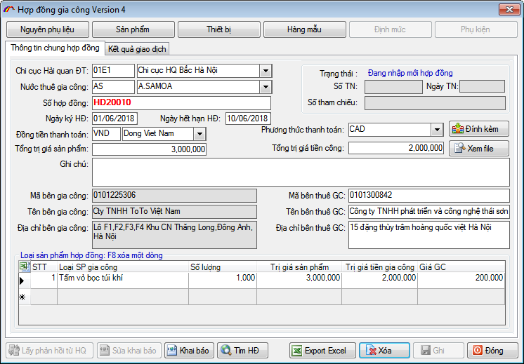 Bạn nhập vào thông tin hợp đồng, danh mục nguyên phụ liệu, sản phẩm, thiết bị, hàng mẫu kèm theo. Sau đó Ghi lại và nhấn "Khai báo" để khai báo thông tin hợp đồng đến hệ thống Hải quan.