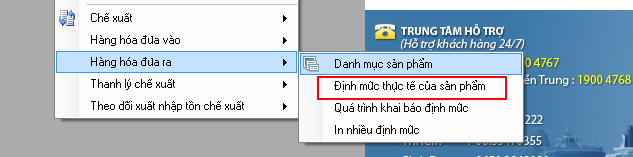 Đối với định mức thực tế của sản phẩm, bạn vào menu “Loại hình / Sản xuất xuất khẩu” và chọn “Định mức thực tế của sản phẩm”: