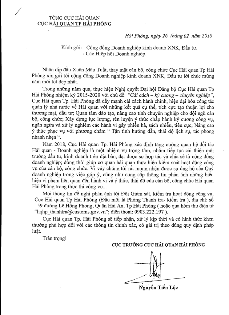 Thông báo Cục Hải Quan Thành Phố Hải Phòng gửi Cộng Đồng Doanh Nghiệp Kinh Doanh XNK, Đầu tư.
